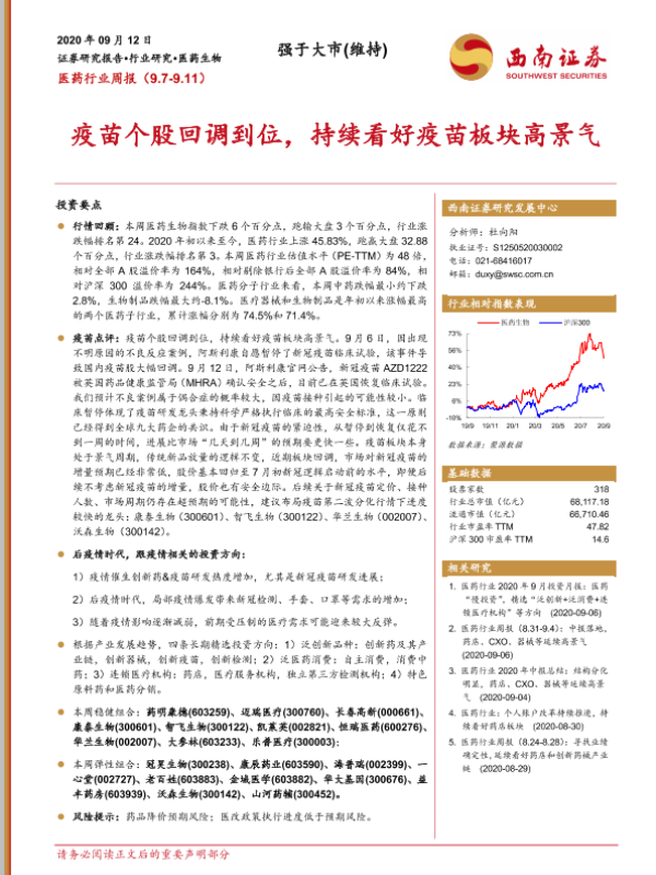【西南证券】【20200912】医药行业周报:疫苗个股回调到位,持续看好疫苗板块高景气-27页