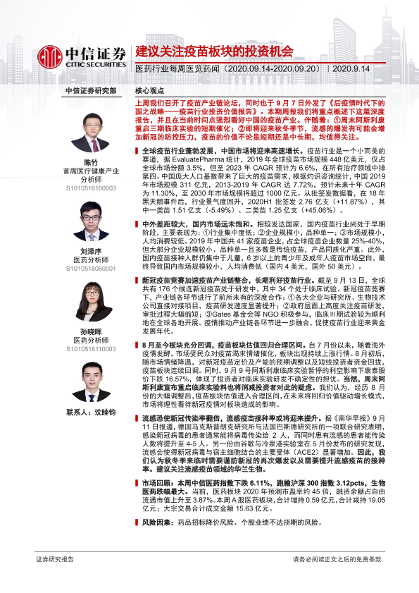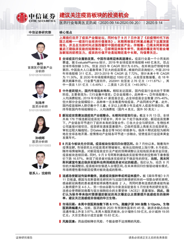 【中信证券】【20200914】医药行业每周医览药闻:建议关注疫苗板块的投资机会-19页