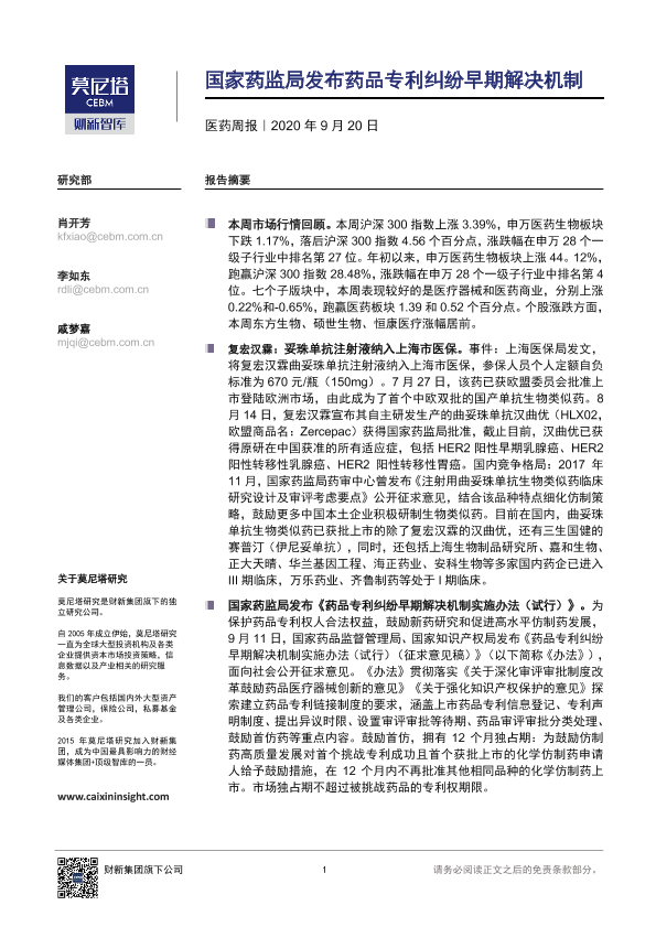 【莫尼塔研究】【20200920】国家药监局发布药品专利纠纷早期解决机制-7页