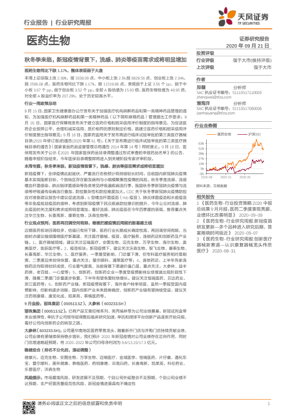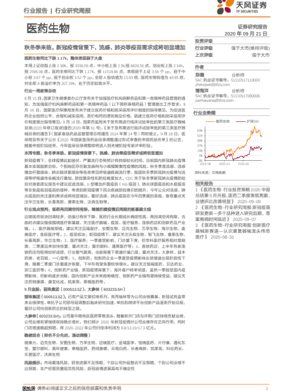 【天风证券】【20200921】医药生物行业研究周报:秋冬季来临,新冠疫情背景下,流感、肺炎等疫苗需求或将明显增加-17页