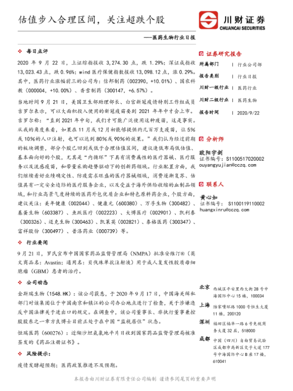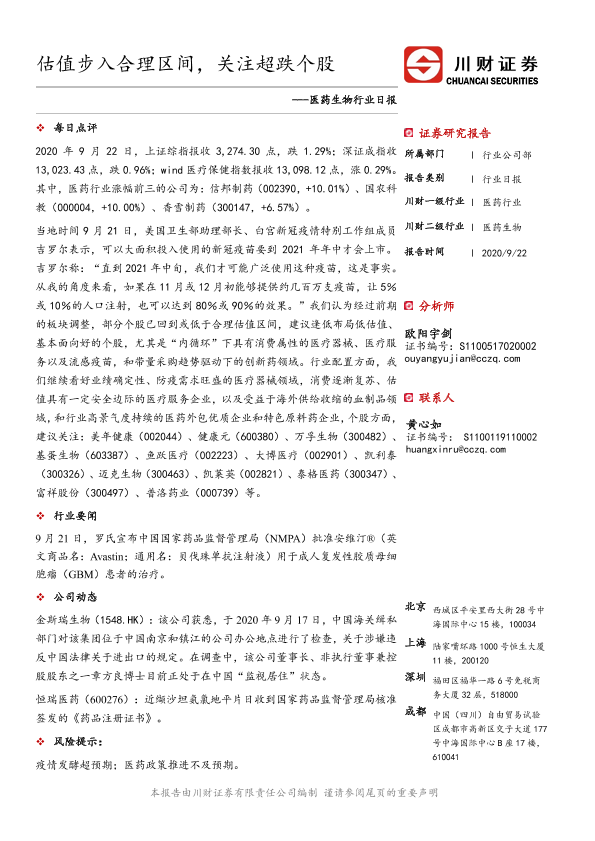 【川财证券】【20200922】医药生物行业日报:估值步入合理区间,关注超跌个股-3页