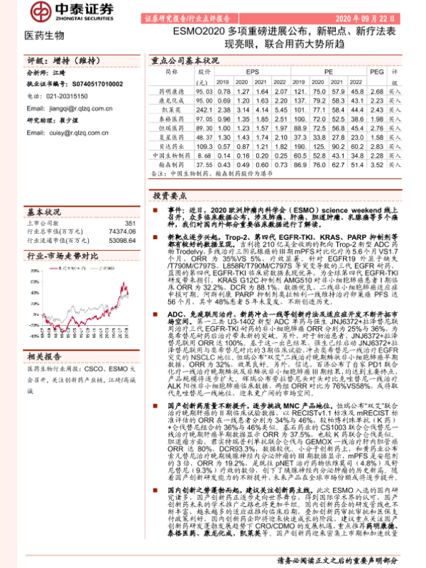 【中泰证券】【20200922】ESMO2020多项重磅进展公布,新靶点、新疗法表现亮眼,联合用药大势所趋-12页