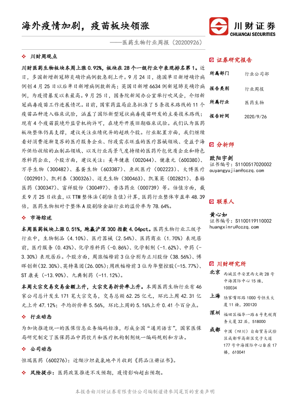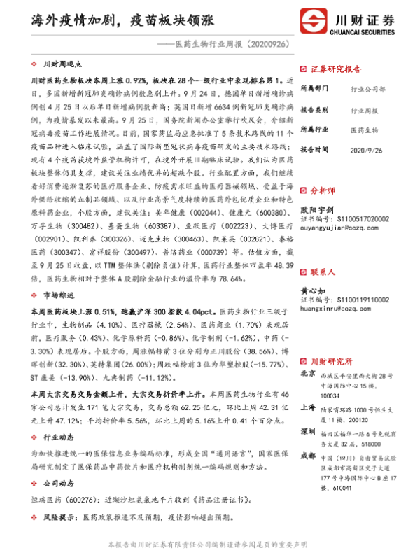 【川财证券】【20200926】医药生物行业周报:海外疫情加剧,疫苗板块领涨-16页