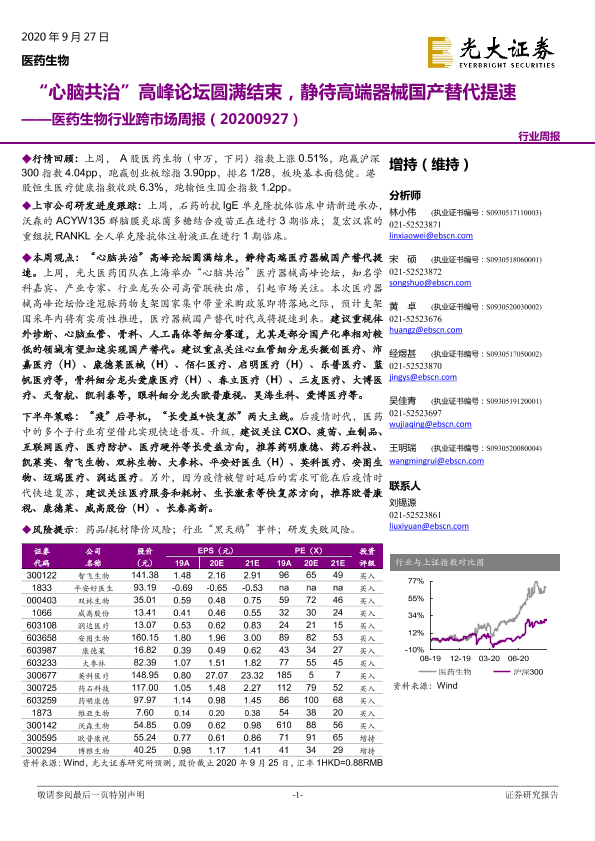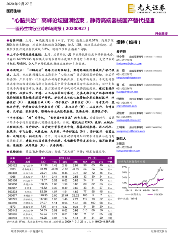 【光大证券】【20200927】医药生物行业跨市场周报:“心脑共治”高峰论坛圆满结束,静待高端器械国产替代提速-31页