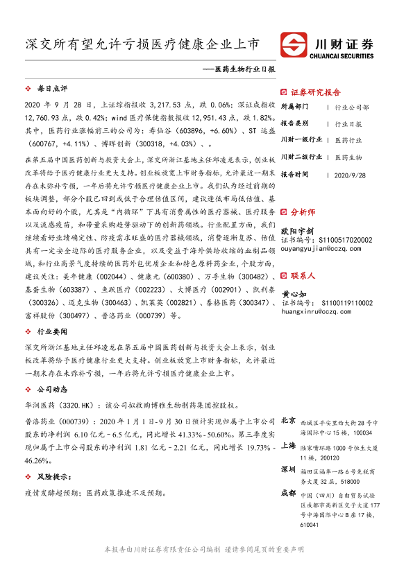 【川财证券】【20200928】医药生物行业日报:深交所有望允许亏损医疗健康企业上市-3页