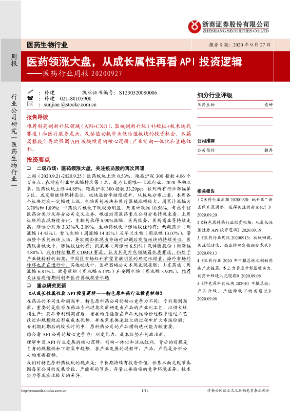 【浙商证券】【20200927】医药领涨大盘,从成长属性再看API投资逻辑-14页