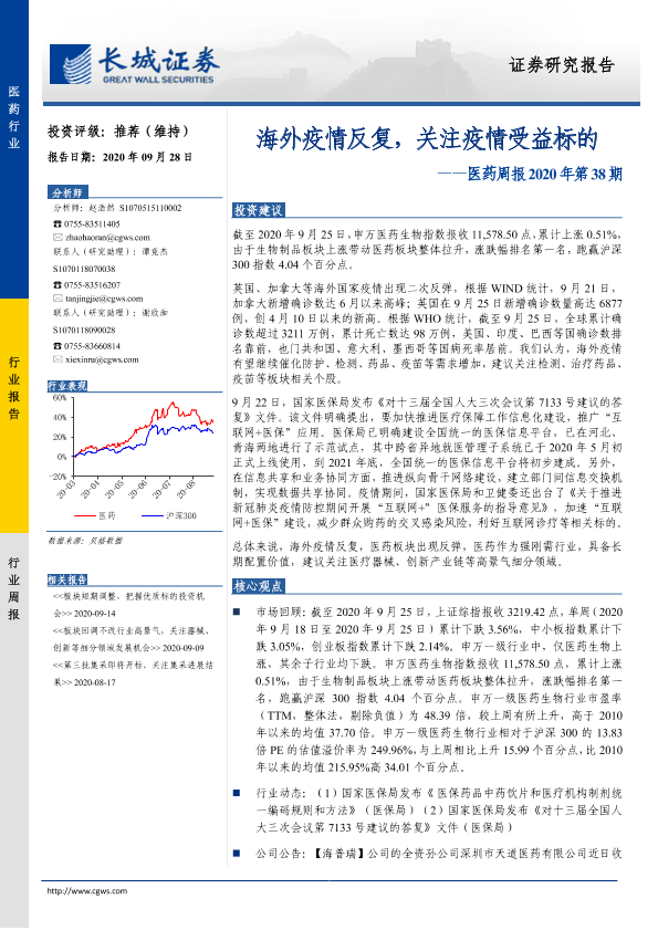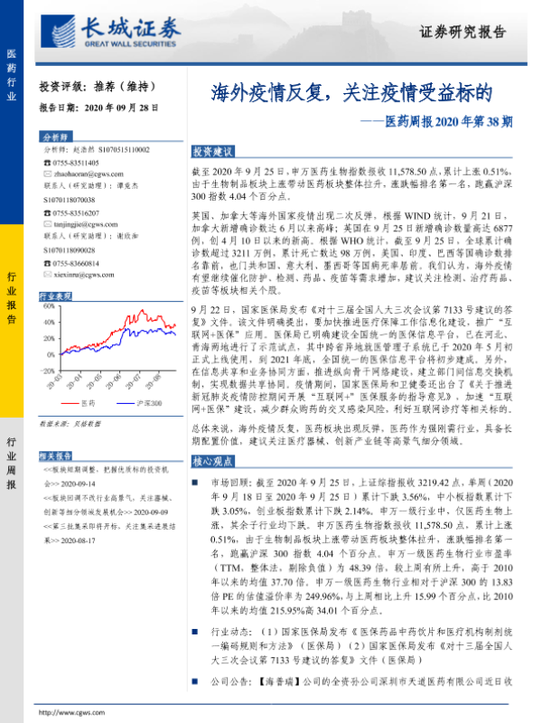 【长城证券】【20200928】医药周报2020年第38期:海外疫情反复,关注疫情受益标的-16页