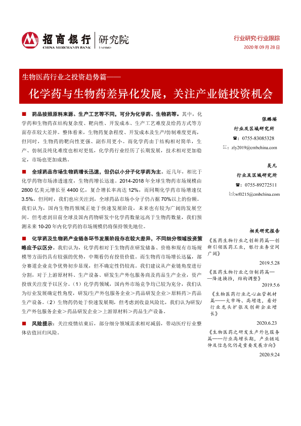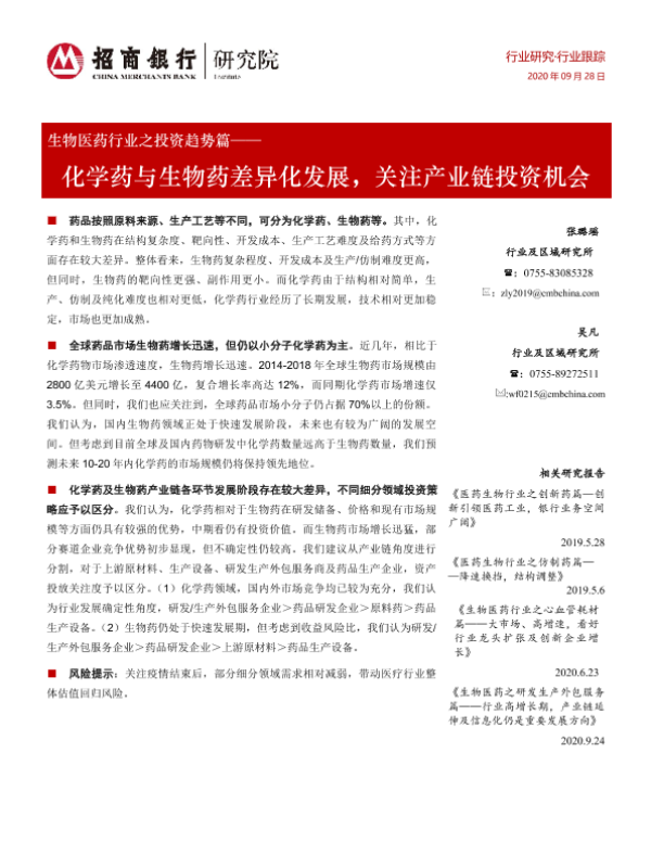 【招商银行】【20200928】生物医药行业之投资趋势篇:化学药与生物药差异化发展,关注产业链投资机会-9页