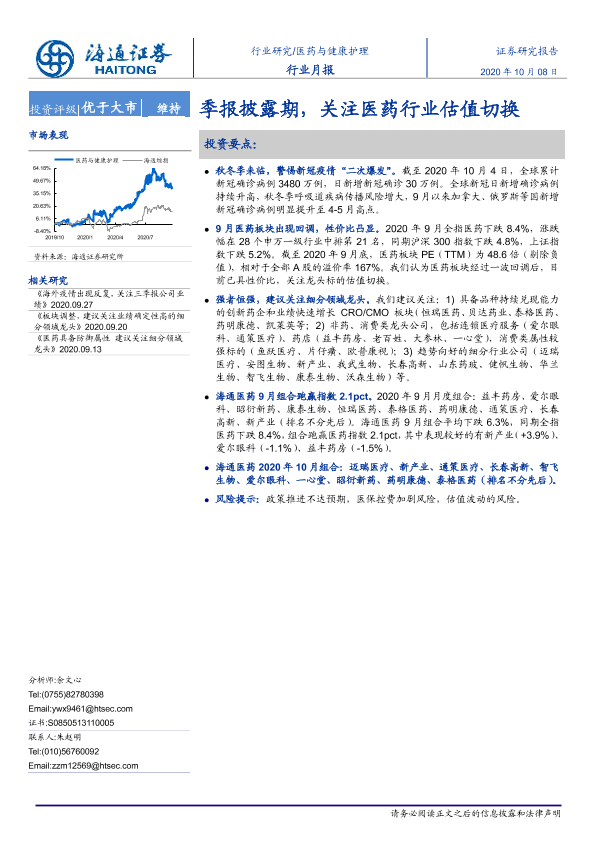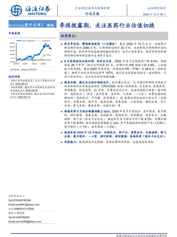【海通证券】【20201008】医药与健康护理行业月报:季报披露期,关注医药行业估值切换-5页