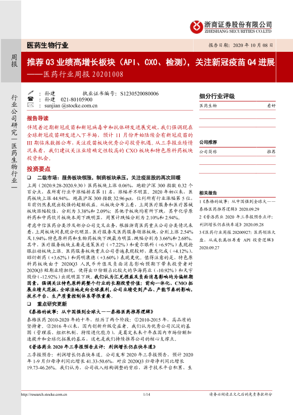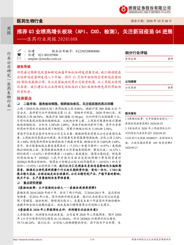 【浙商证券】【20201008】医药行业周报:推荐Q3业绩高增长板块(API、CXO、检测),关注新冠疫苗Q4进展-14页