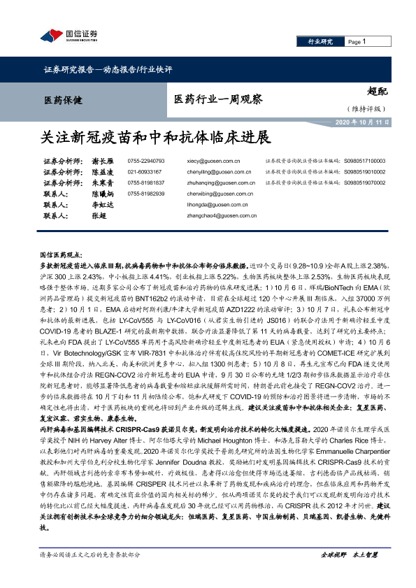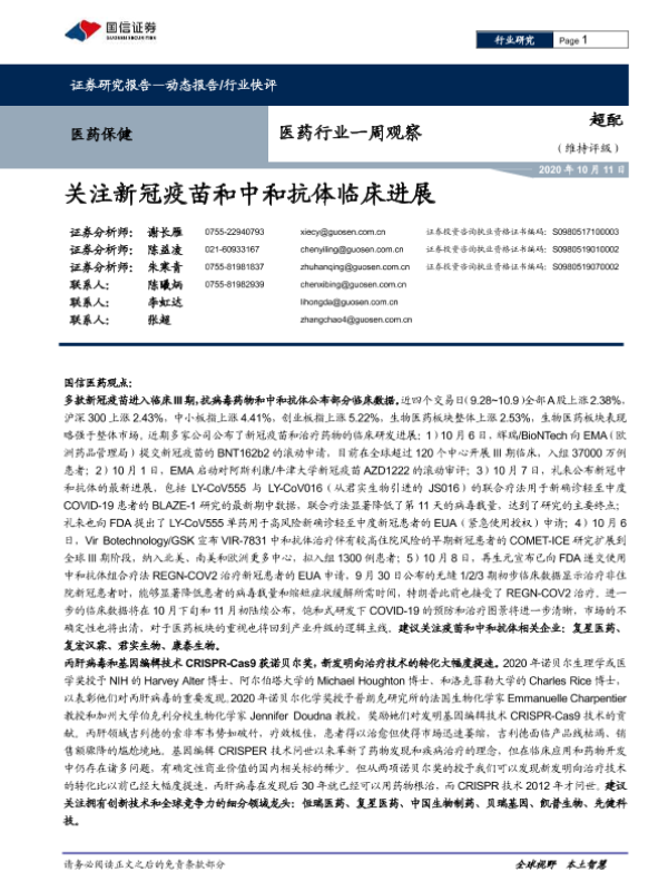 【国信证券】【20201011】医药行业一周观察:关注新冠疫苗和中和抗体临床进展-11页