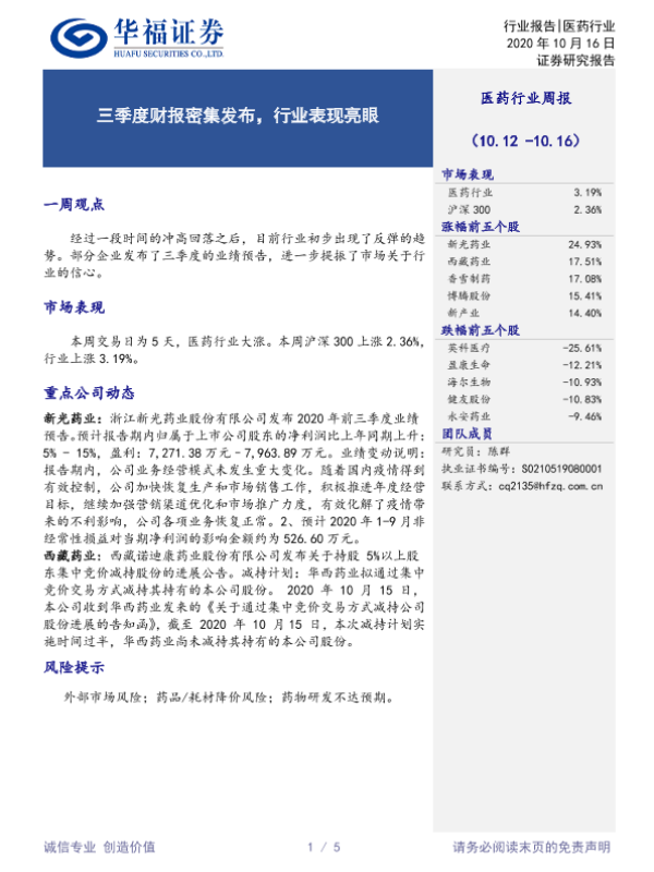 【华福证券】【20201016】医药行业周报:三季度财报密集发布,行业表现亮眼-5页