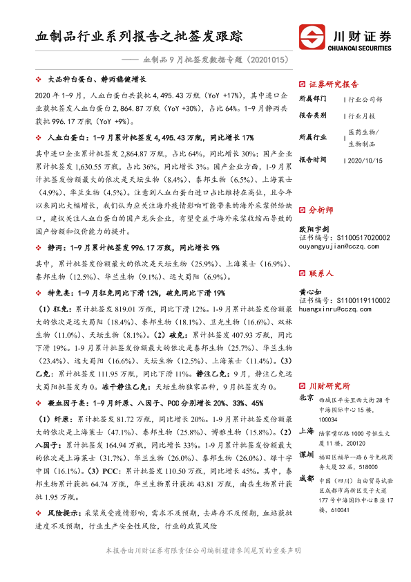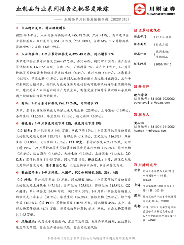 【川财证券】【20201015】血制品9月批签发数据专题:血制品行业系列报告之批签发跟踪-18页