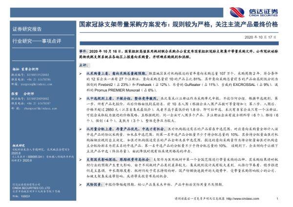 【信达证券】【20201017】国家冠脉支架带量采购方案发布:规则较为严格,关注主流产品最终价格-4页