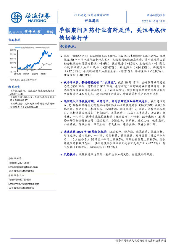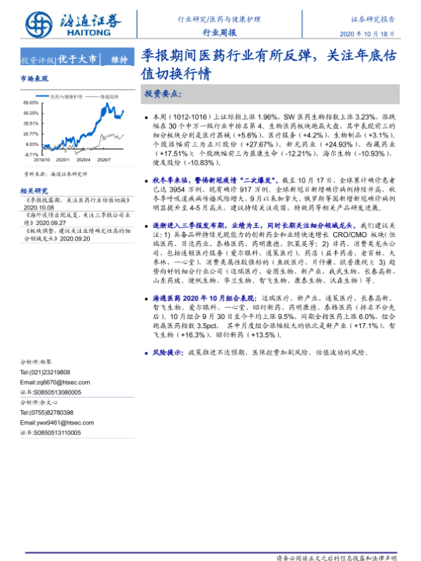 【海通证券】【20201018】医药与健康护理行业周报:季报期间医药行业有所反弹,关注年底估值切换行情-5页