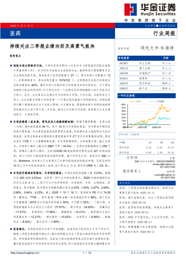 【华金证券】【20201018】医药行业周报:持续关注三季报业绩向好及高景气板块-12页
