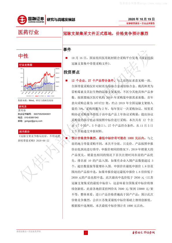【国融证券】【20201019】医药行业:冠脉支架集采文件正式落地,价格竞争预计激烈-3页