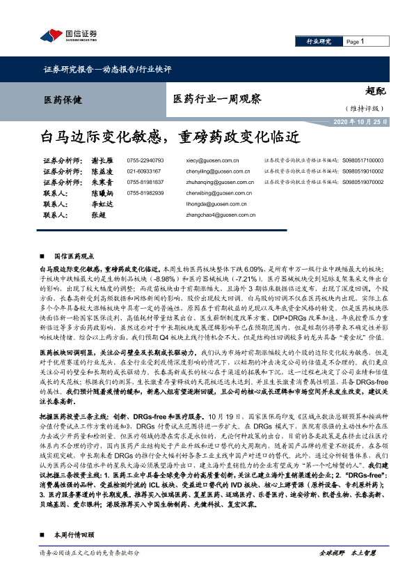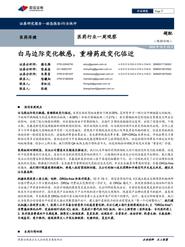 【国信证券】【20201025】医药行业一周观察:白马边际变化敏感,重磅药政变化临近-10页