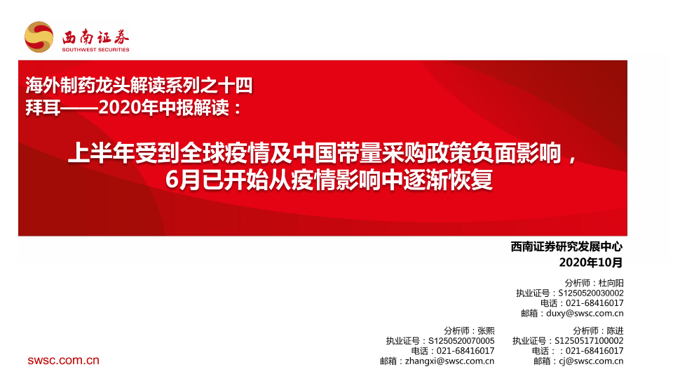 【西南证券】【202010】2020年中报解读:上半年受到全球疫情及中国带量采购政策负面影响,6月已开始从疫情影响中逐渐恢复-14页