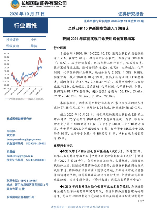【长城国瑞证券】【20201027】医药生物行业双周报:全球已有10种新冠疫苗进入3期临床 我国2021年底前实现门诊费用跨省直接结算-17页