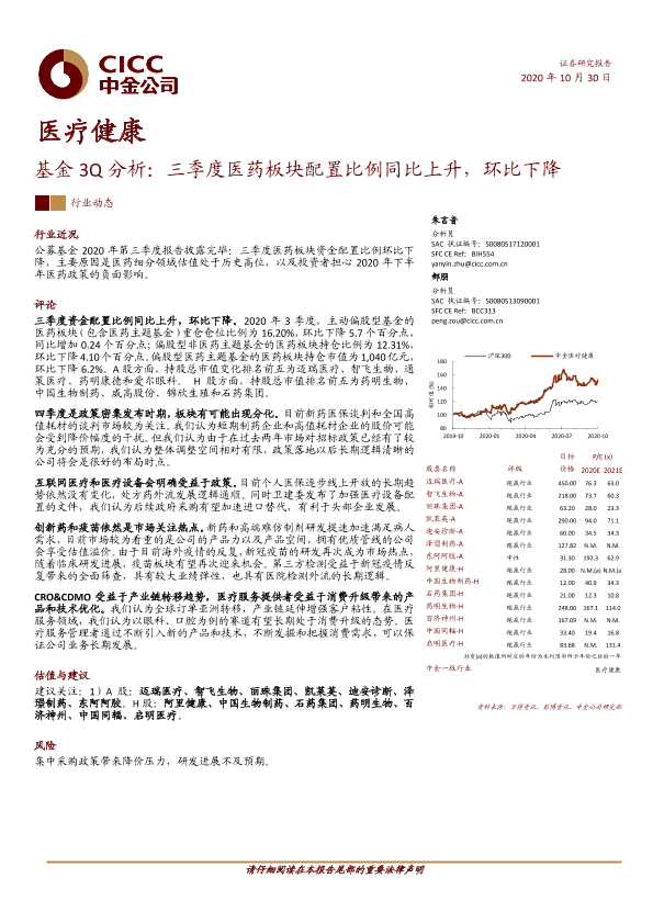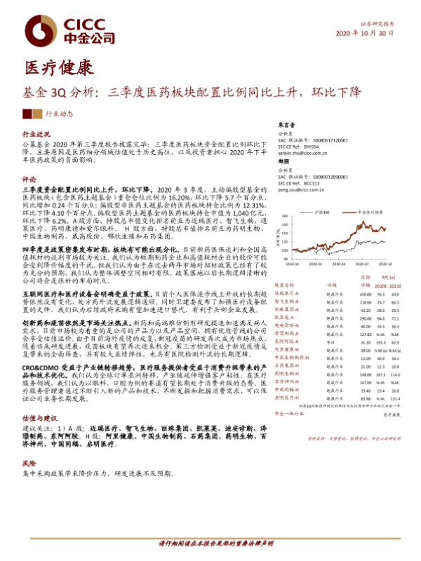 【中金公司】【20201030】基金3Q分析:三季度医药板块配置比例同比上升,环比下降-8页