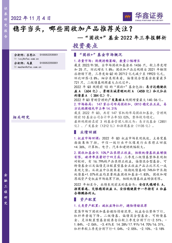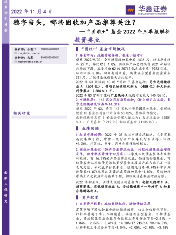 【华鑫证券】【20221104】“固收+”基金2022年三季报解析:稳字当头,哪些固收加产品推荐关注?-20页