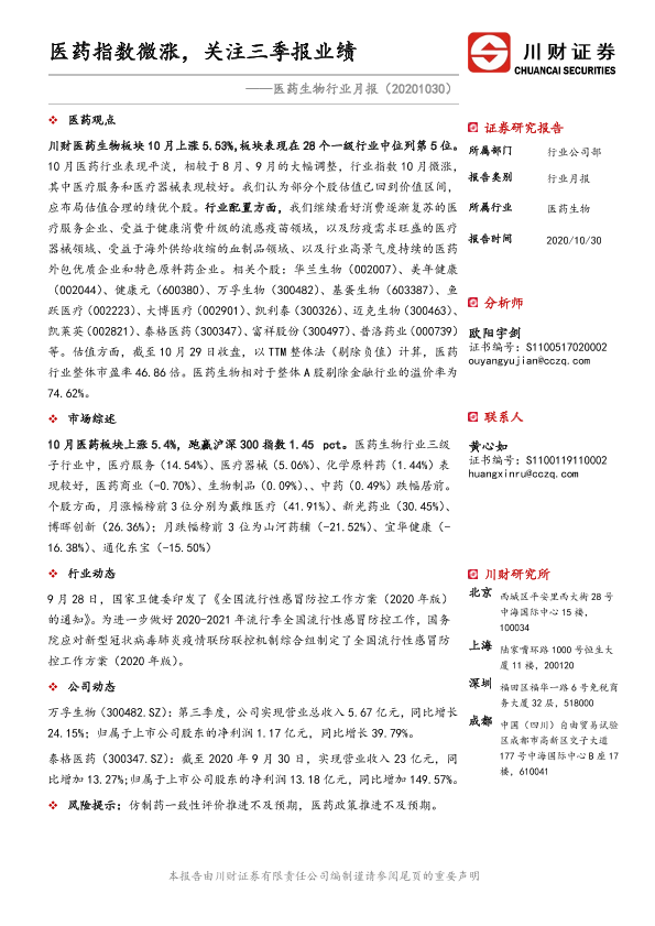 【川财证券】【20201030】医药生物行业月报:医药指数微涨,关注三季报业绩-13页
