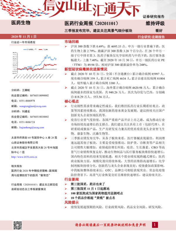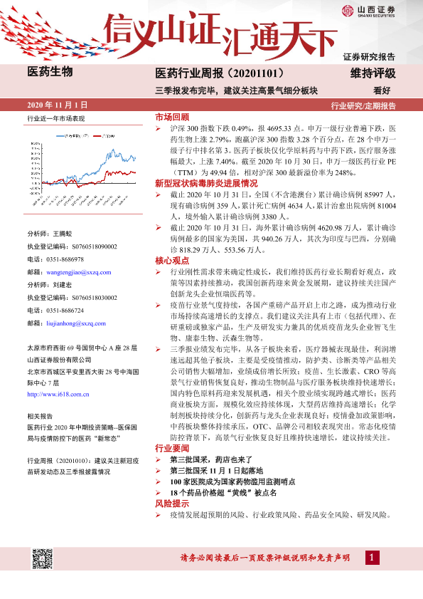 【山西证券】【20201101】医药行业周报:三季报发布完毕,建议关注高景气细分板块-9页