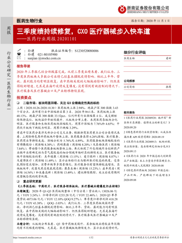 【浙商证券】【20201101】三季度绩持续修复,CXO医疗器械步入快车道-32页