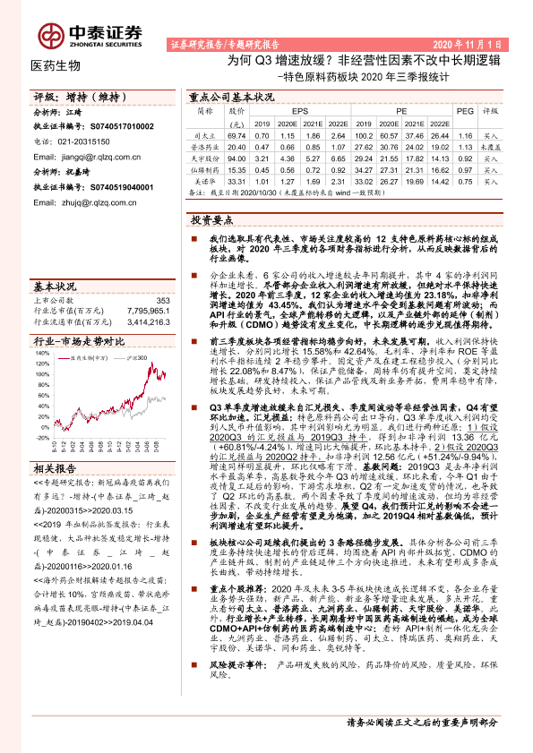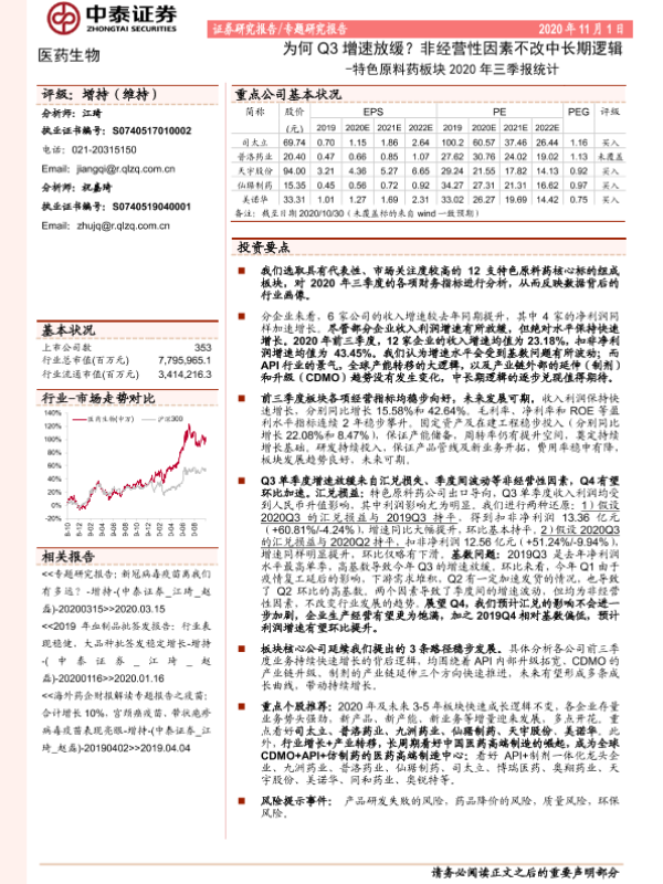 【中泰证券】【20201101】特色原料药板块2020年三季报统计:为何Q3增速放缓?非经营性因素不改中长期逻辑-11页