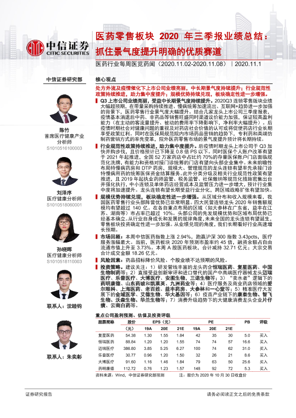 【中信证券】【20201101】医药零售板块2020年三季报业绩总结:抓住景气度提升明确的优质赛道-46页