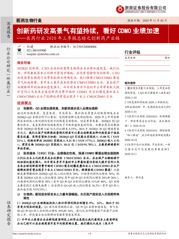 【浙商证券】【20201102】医药行业2020年三季报总结之创新药产业链:创新药研发高景气有望持续,看好CDMO业绩加速-9页