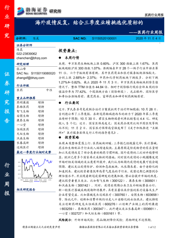 【渤海证券】【20201104】医药行业周报:海外疫情反复,结合三季度业绩挑选优质标的-12页