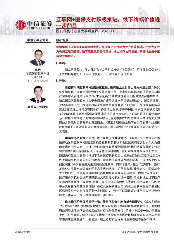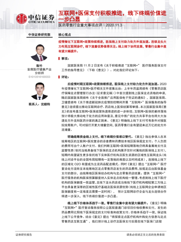 【中信证券】【20201103】医药零售行业重大事项点评:互联网+医保支付积极推进,线下终端价值进一步凸显-3页