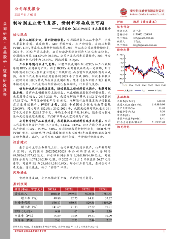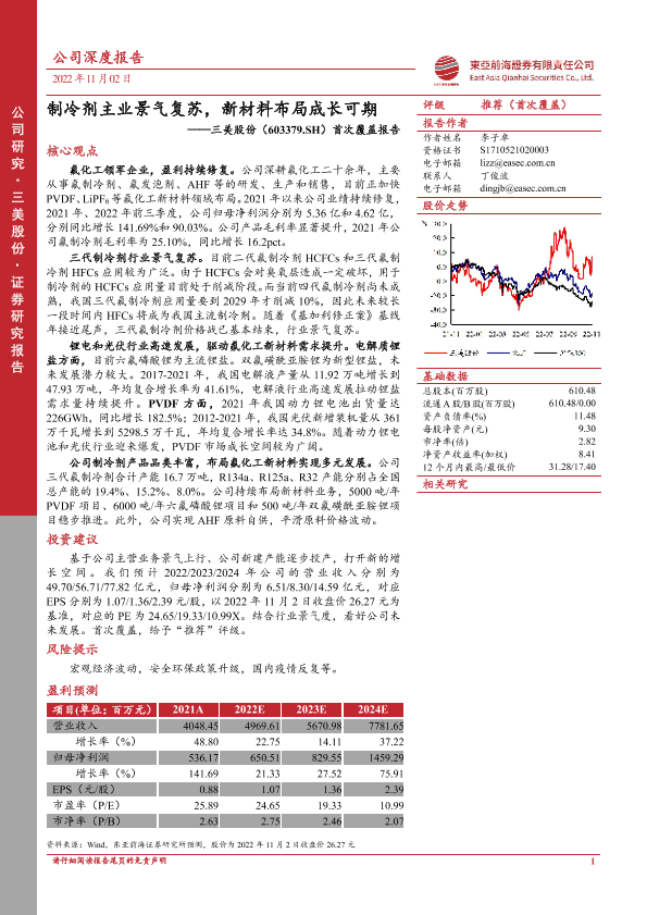 【东亚前海证券】【20221102】三美股份603379.SH首次覆盖报告:制冷剂主业景气复苏,新材料布局成长可期-22页