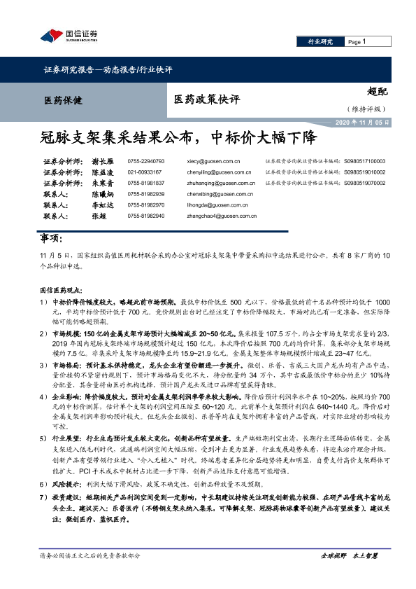 【国信证券】【20201105】医药政策快评:冠脉支架集采结果公布,中标价大幅下降-9页