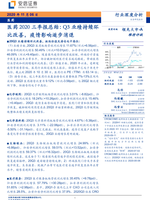【安信证券】【20201106】医药2020三季报总结:Q3业绩持续环比改善,疫情影响逐步消退-43页