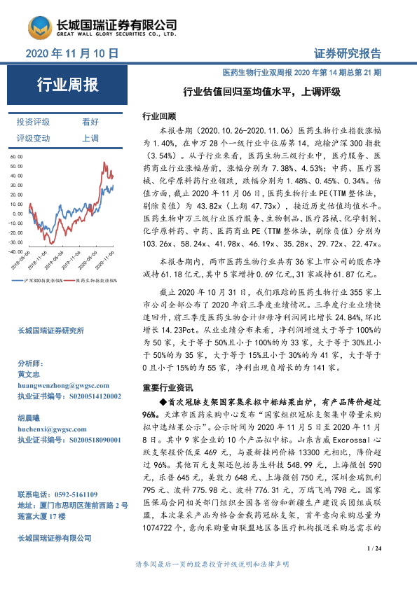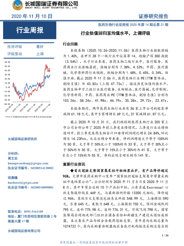 【长城国瑞证券】【20201110】医药生物行业双周报2020年第14期总第21期:行业估值回归至均值水平,上调评级-24页