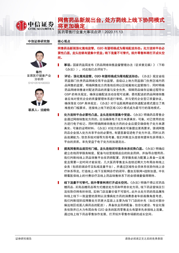 【中信证券】【20201113】网售药品新规出台,处方药线上线下协同模式将更加确定-3页