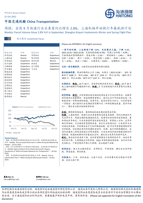 【海通国际】【20221102】中国交通运输周报:全国9月快递行业业务量同比增长28%,上海机场开始执行冬春航班计划-15页