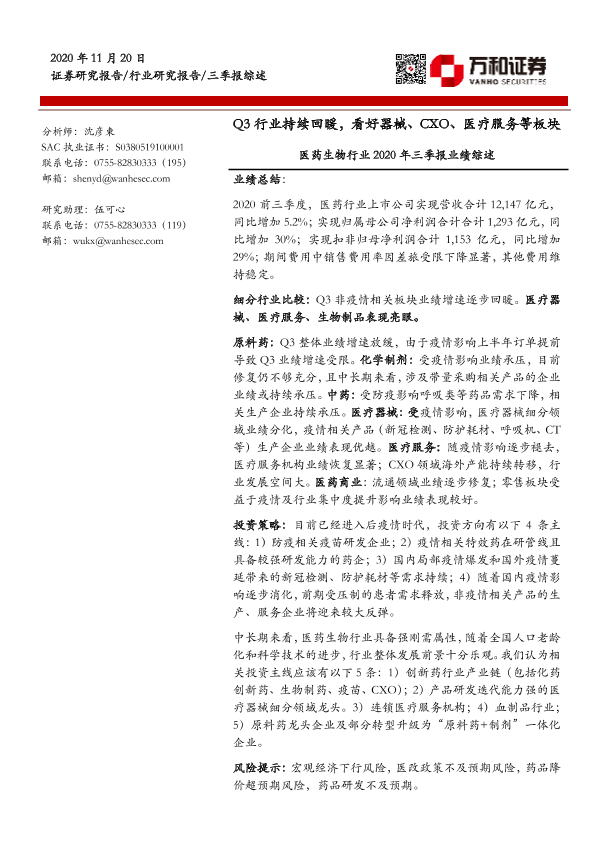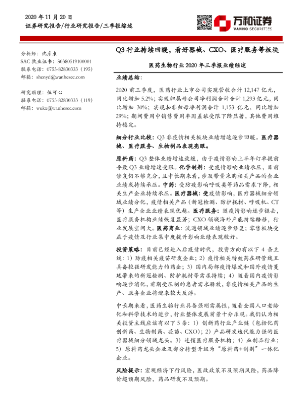 【万和证券】【20201120】医药生物行业2020年三季报业绩综述-31页