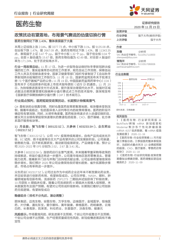 【天风证券】【20201123】医药生物行业研究周报:政策扰动有望落地,布局景气赛道的估值切换行情-16页