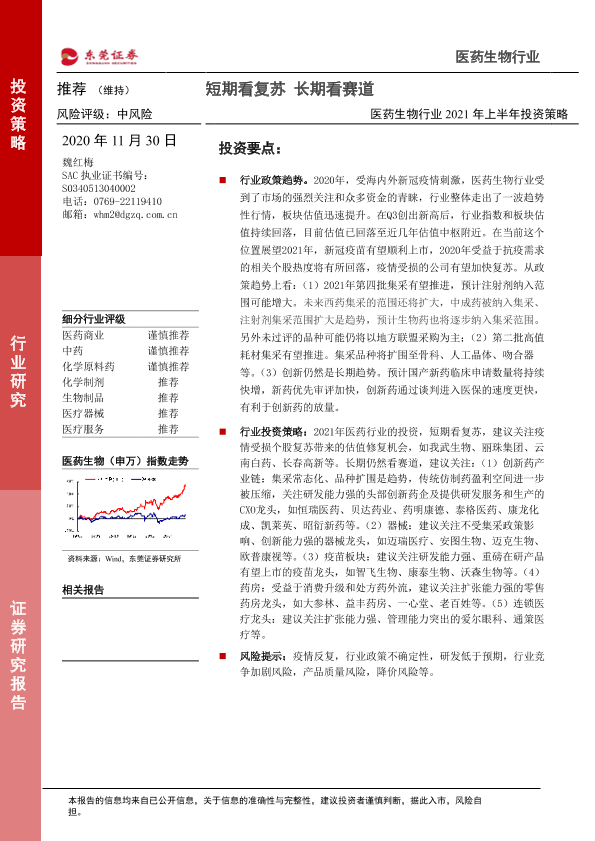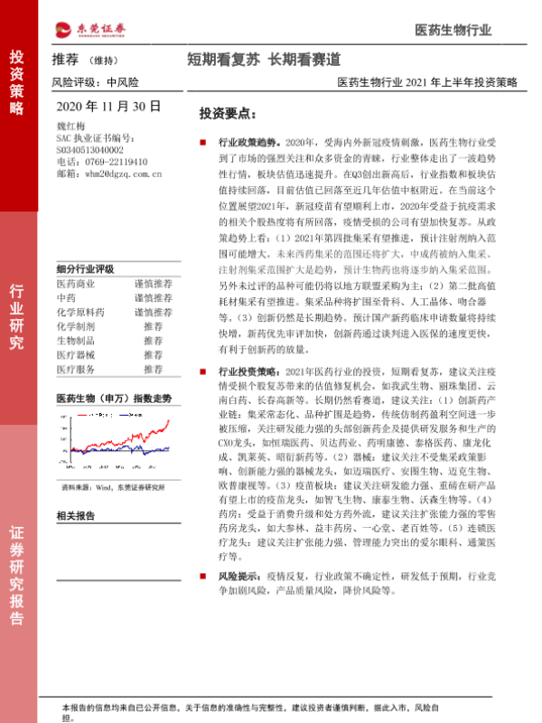 【东莞证券】【20201130】医药生物行业2021年上半年投资策略:短期看复苏 长期看赛道-26页