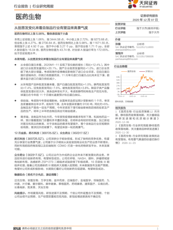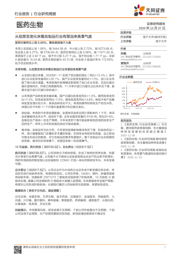 【天风证券】【20201207】从批签发变化来看血制品行业有望迎来高景气度-22页