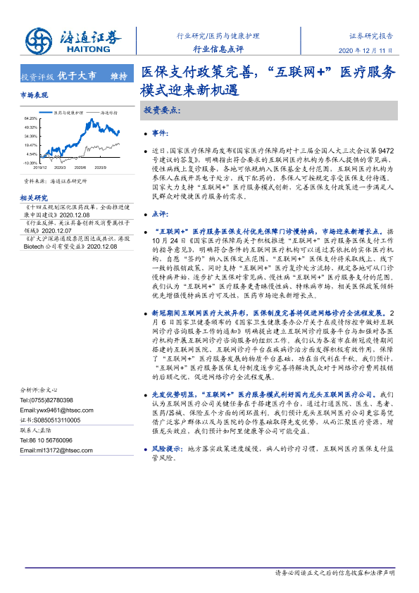 【海通证券】【20201211】医药与健康护理行业信息点评:医保支付政策完善,“互联网+”医疗服务模式迎来新机遇-2页