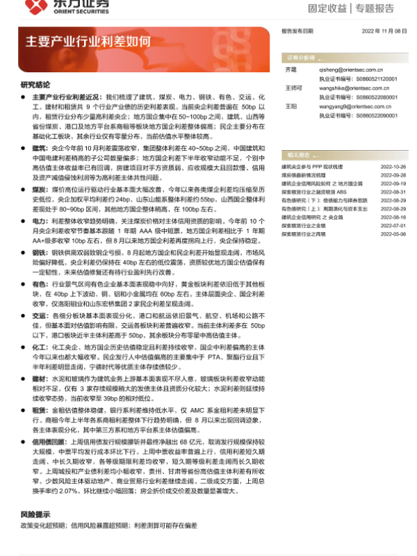 信用风险 利差分析 固定收益 行业动态 产业债
