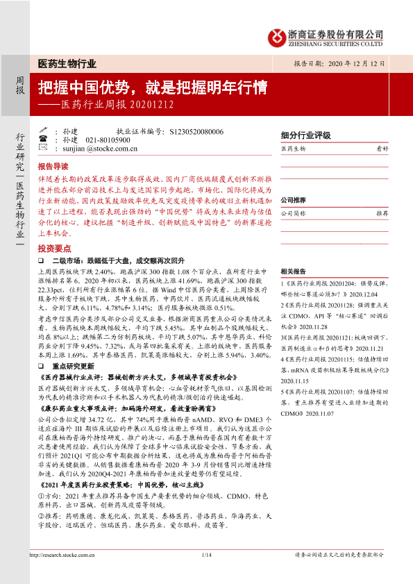 【浙商证券】【20201212】医药行业周报:把握中国优势,就是把握明年行情-14页
