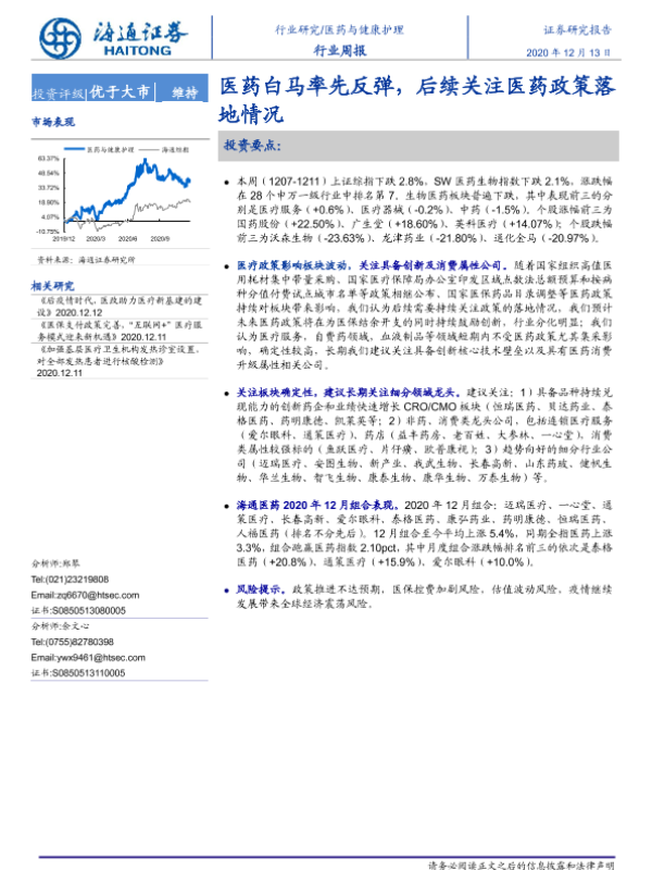 【海通证券】【20201213】医药与健康护理业周报:医药白马率先反弹,后续关注医药政策落地情况-5页
