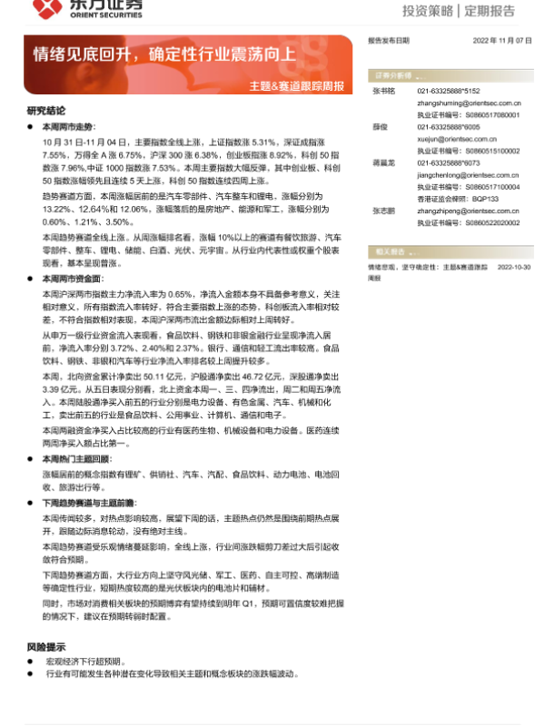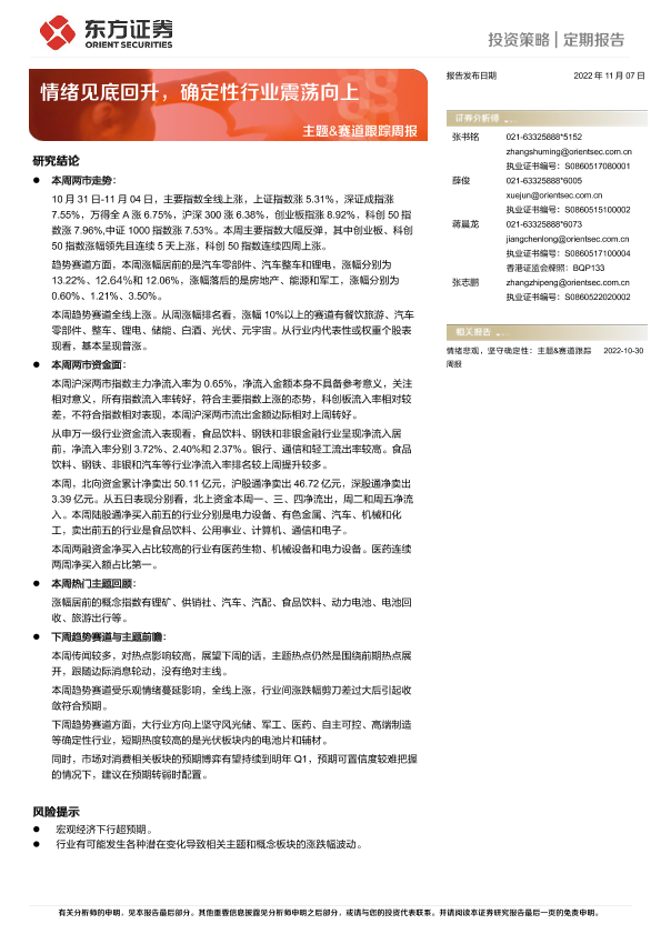 【东方证券】【20221107】主题&赛道跟踪周报:情绪见底回升,确定性行业震荡向上-15页