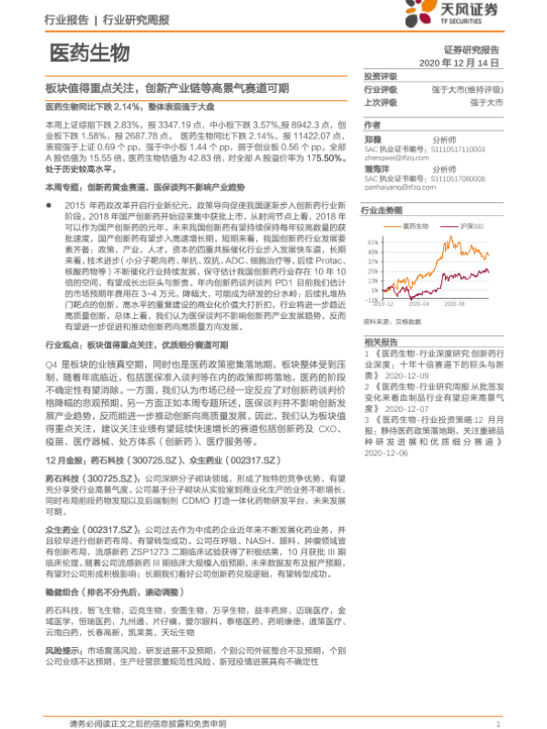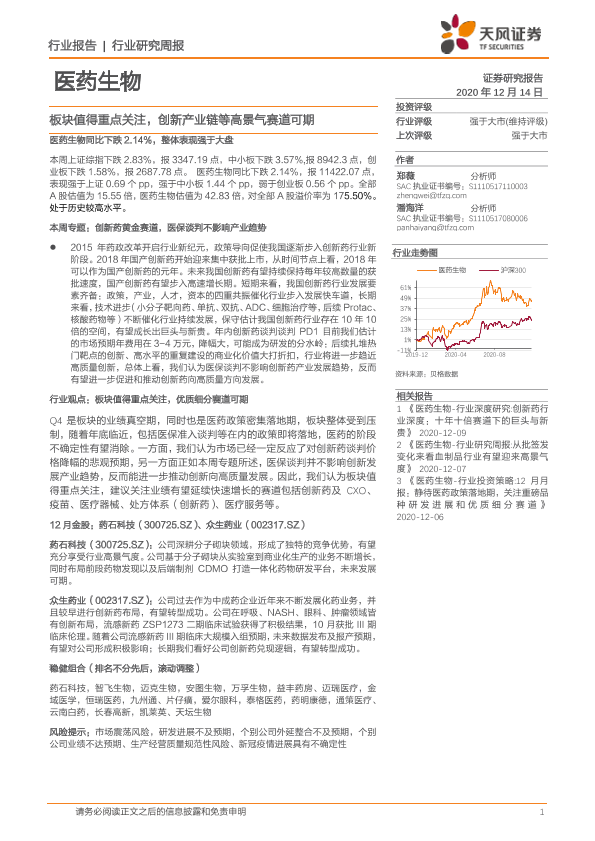 【天风证券】【20201214】医药生物行业研究周报:板块值得重点关注,创新产业链等高景气赛道可期-19页